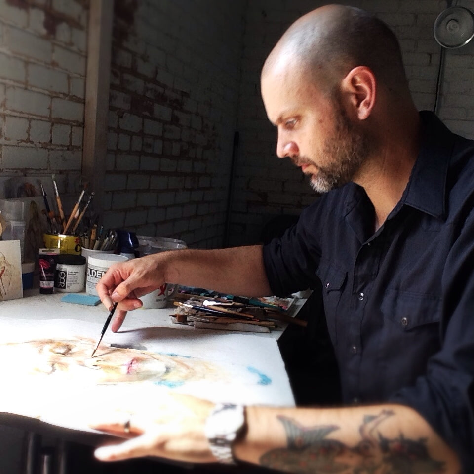 Jay Bailey’s paintings are figurative combinations of line drawings and watercolor stains. His figures balance between quick gesture, rendered realism, and abstract mark making with much of his work’s imagery coming from his personal experience.