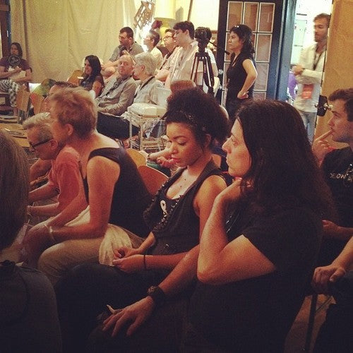 Late Night with Jean Paul Gautier – Oil and Cotton curated a one night only site-specific art installation of contemporary art and domestic craft in the DMA's Fleischner Courtyard. Guests were invited to spin wool and contribute to a community weaving with June Covington, who shared her expertise on domestic and fiber arts history. Crisman Liverman performed his dress, a billowing patchwork of fabrics, which created an interactive dance party for museumgoers to enter, participate in, and behold. Rebecca Carter created an installation of her delicate threaded text pieces created specifically for this event. 2011.