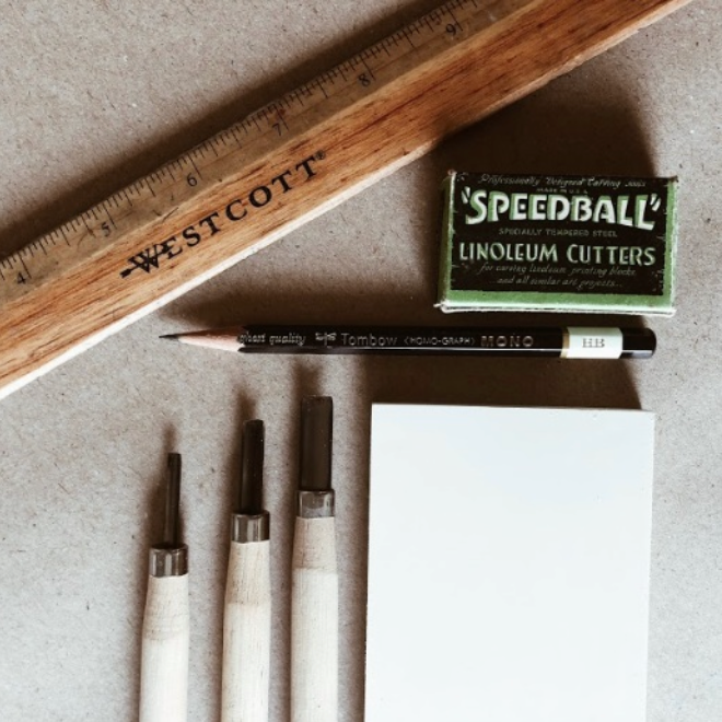 Learn to design, carve and make a block print. Explore the graphic possibilities of repetition and pattern making techniques. Create hand-pulled prints without a press or complicated materials. Each student will leave with a carved rubber block, a pocket size notebook customized with their print and at least three artist proof prints (or cards).