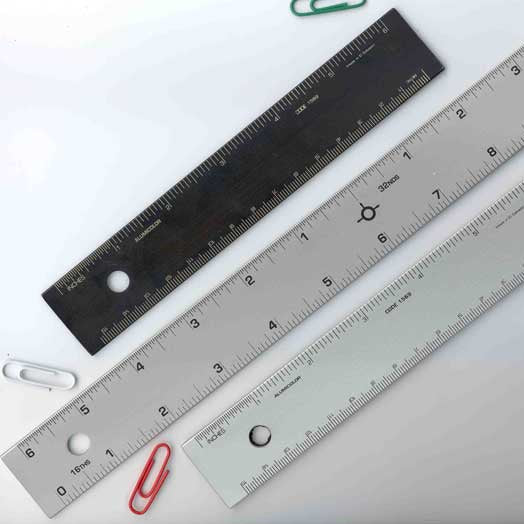 Non-flexible tempered aluminum with ultra-smooth edges. Photo anodized calibrations in inches and centimeters with center finding calibrations on back.
