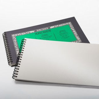 The Arches Watercolor Travel Journal contains 140 lb cold pressed, natural white, 100% cotton rag watercolor paper. The high quality pulp-dyed black cover and backing board provides rigidity for more comfortable working. The journal also works well for mixed media applications. Metal spiral binding on the short side.
