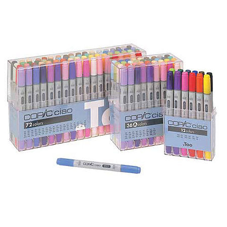 COPIC Ciao markers are versatile double-ended refillable markers with fast-drying, permanent non-toxic ink. Ciao are the perfect markers for beginners. They have the same ease of use and special features of the COPIC Sketch marker, with a super brush nib and a medium broad nib, yet it has a round barrel and comes in a convenient small size that makes it perfect for young artists. Both nibs are replaceable.