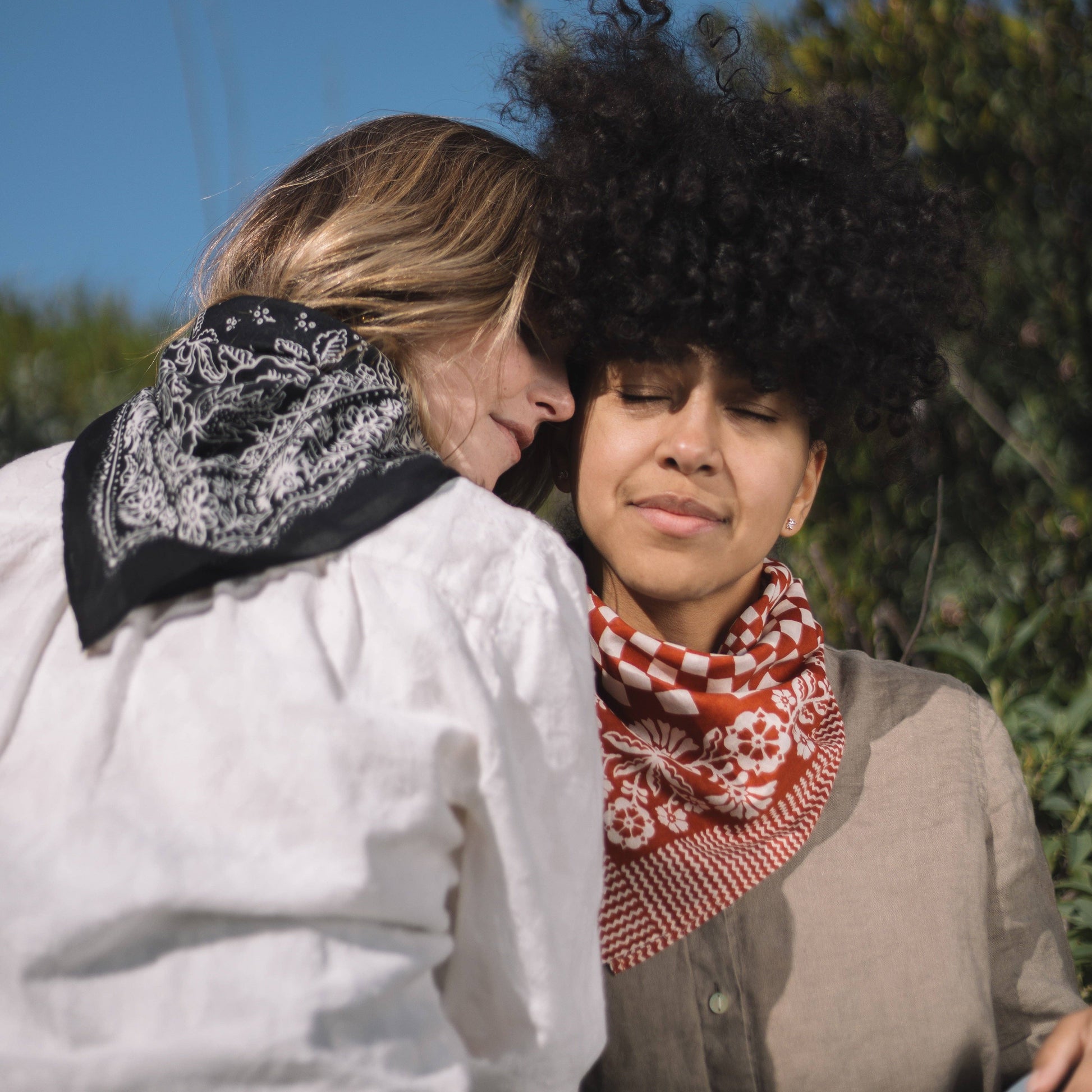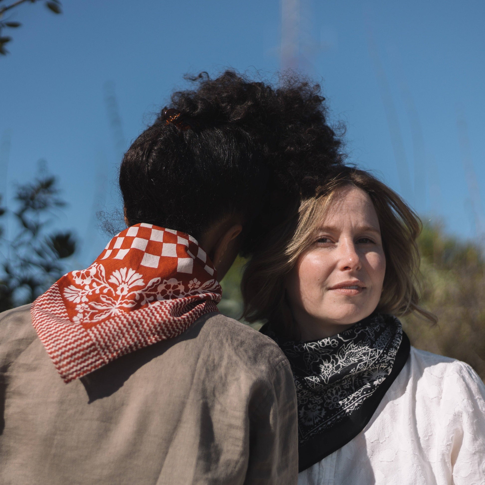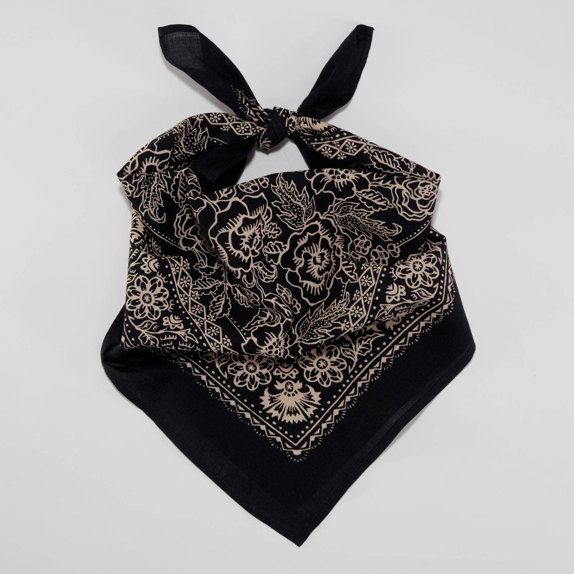 Soft organic cotton dyed a deep pitch black . Rosey-Danna's wild rose pattern inspired by Art Deco illustrator George Barbier, 18th century French textiles. A detailed border pays tribute to Indian woodblock printing. Yep! This one is a real trip.
