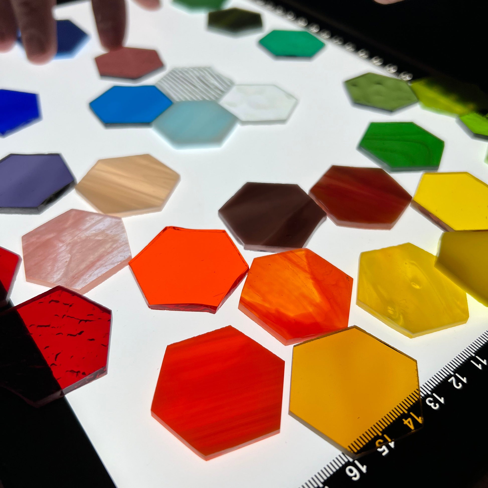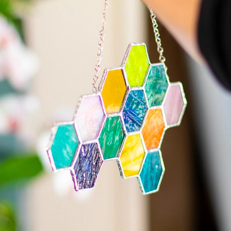 In this relaxed beginner workshop students will learn about all of the techniques that go into stained glass. Students will learn how arrange a balanced composition, copper foil, and solder a unique honeycomb sun catcher. These incredible works offer endless color combinations and change throughout the day as natural light is picked up differently thru the glass.