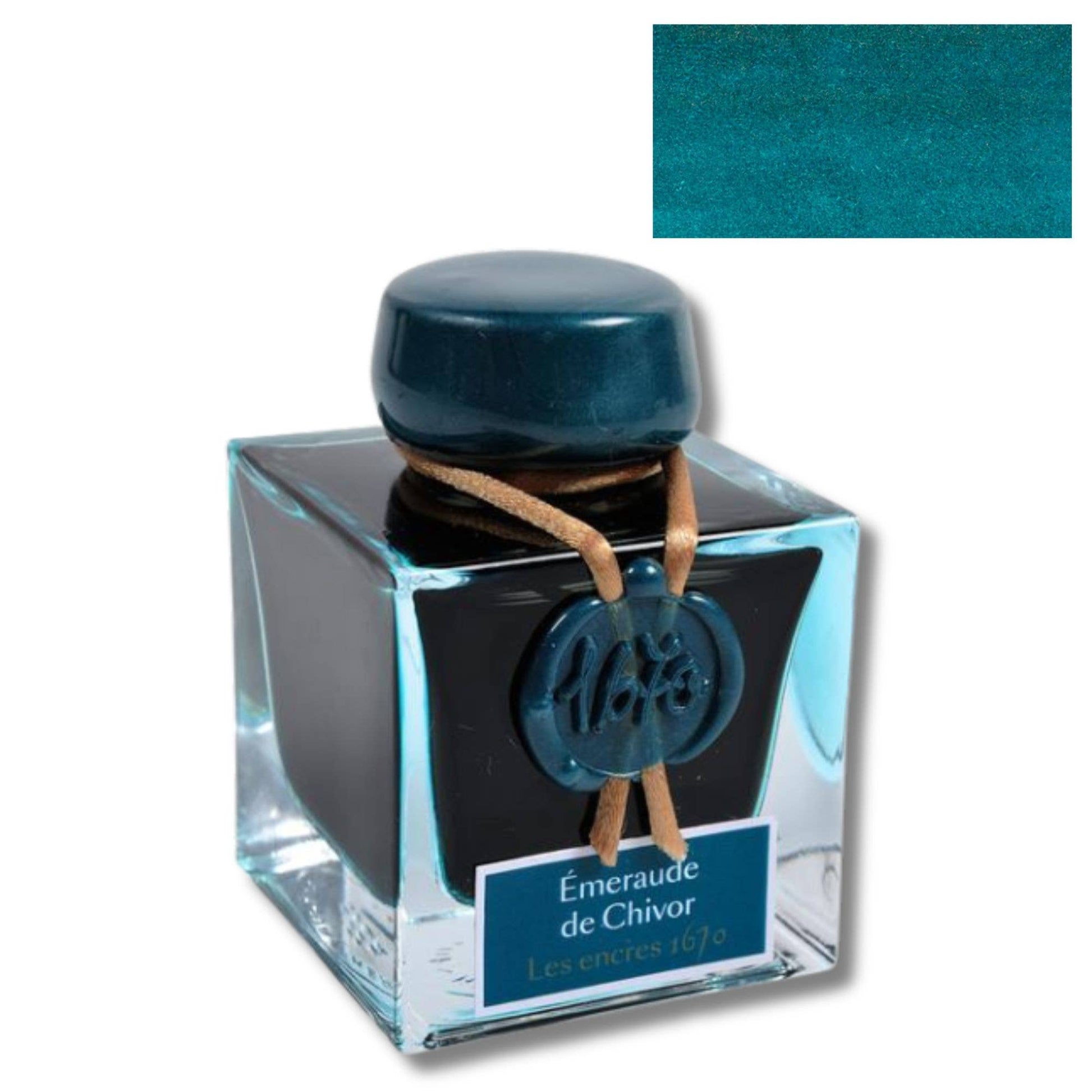 The 1670 Anniversary Collection celebrates the life of the 17th-century French adventurer, Jacques Herbin. Sailing from India, Monsieur Herbin arrived home to Paris with formulas for the now-famous Herbin inks and sealing waxes. Enhanced with a luxurious, golden metallic sheen, these highly saturated inks will add an elegant luster to all your writing. Made in Paris. Hand bottled with wax-dipped cap and seal. Choose from 6 colors. 50ml bottle. MADE IN FRANCE