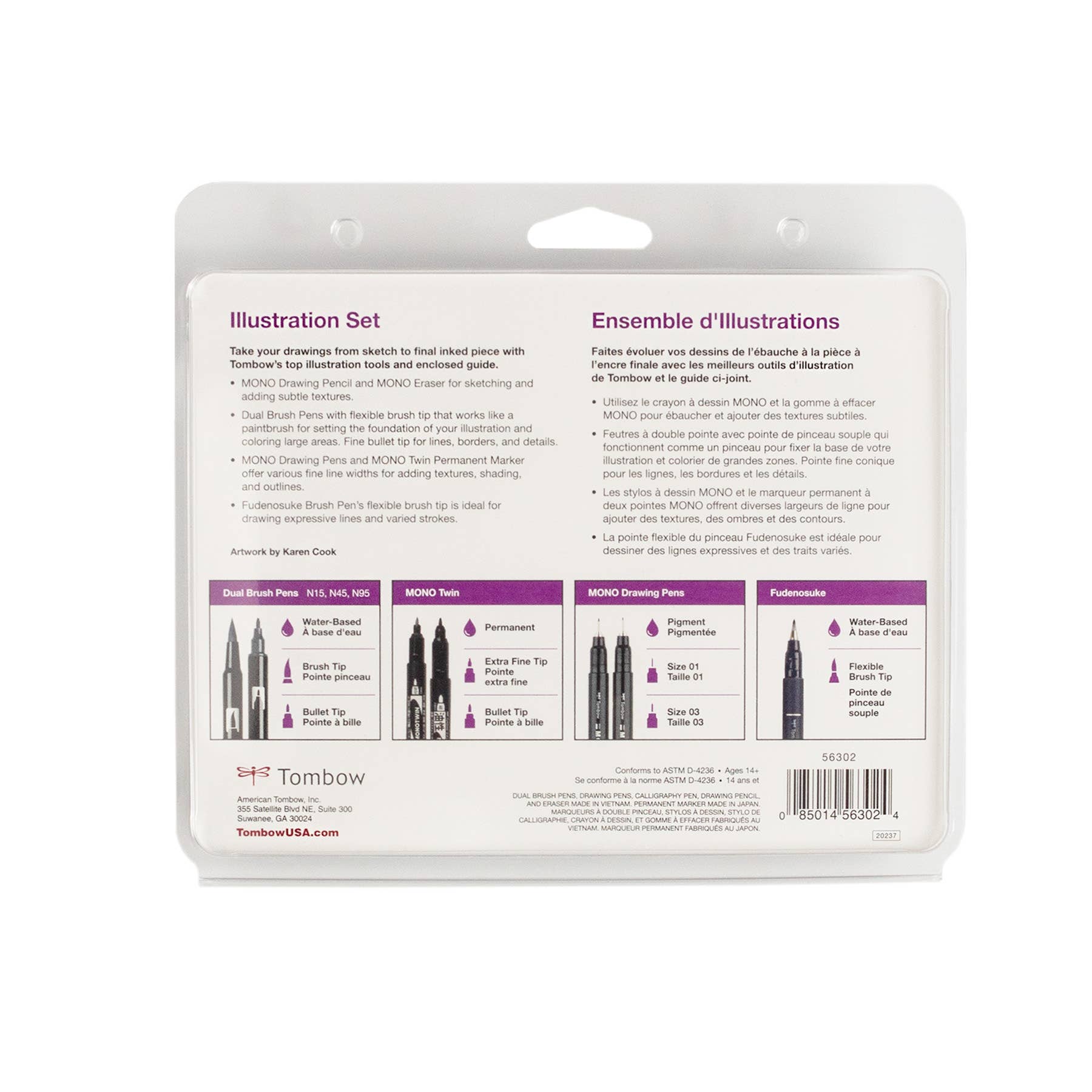 Tombow Illustration Set includes all the tools you need to create pen & ink drawings, sketches and illustrations. Contains instructional guide with helpful tips on basic drawing techniques, layering, value and composition. Features Dual Brush Pen art marker with flexible brush tip and fine tip in one. Set includes three Dual Brush Pens, two MONO Drawing Pens, Fudenosuke Brush Pen, MONO Twin Permanent Marker, MONO Drawing Pencil H and MONO Eraser.