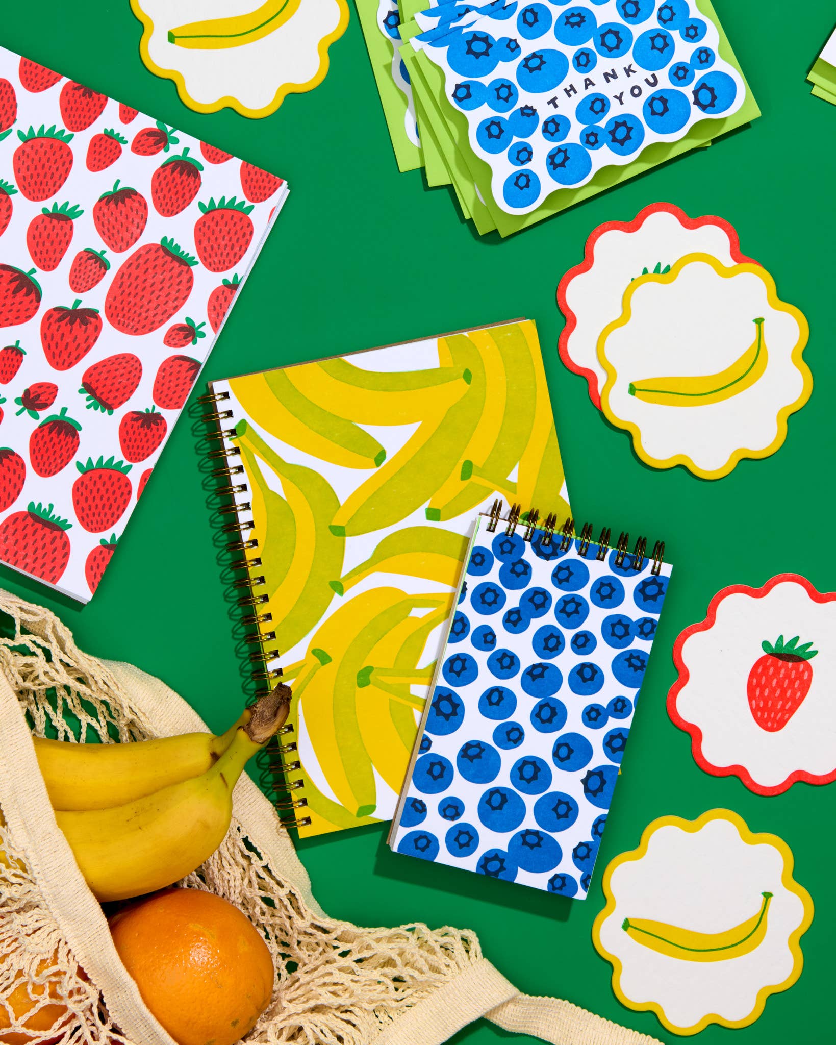 Our best-selling pocket-size letterpress spiral notebook, hand printed with a pattern of vibrant juicy blueberries fresh from the garden. 60 lined pages, made in the USA. Perfect for summer and Mother's Day gifting!.