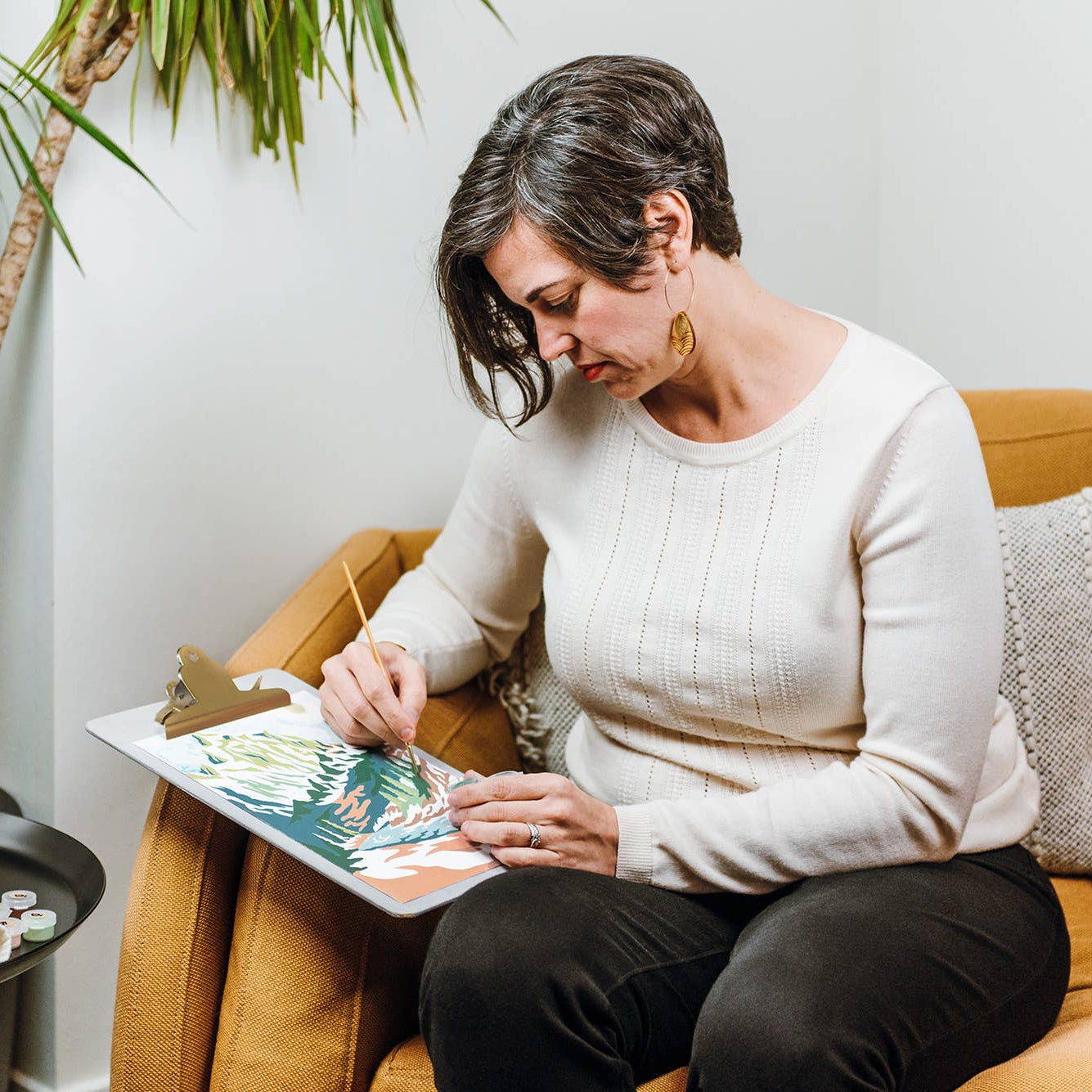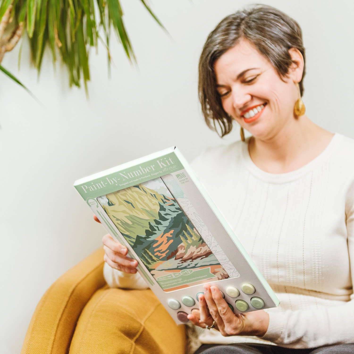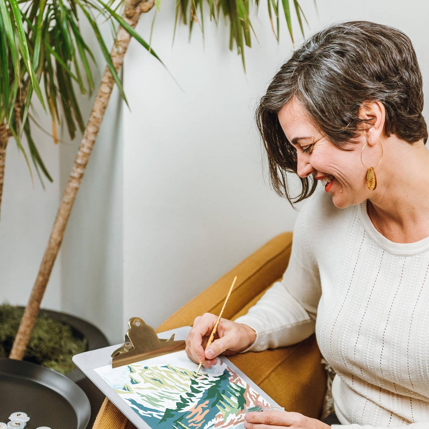 “Mountainscape” features a snowy mountain landscape with a winding river and trees. The pre-printed background features a cloudy sky. Completing the painting can take between 6-8 hours. Recommended for ages 13 and up.