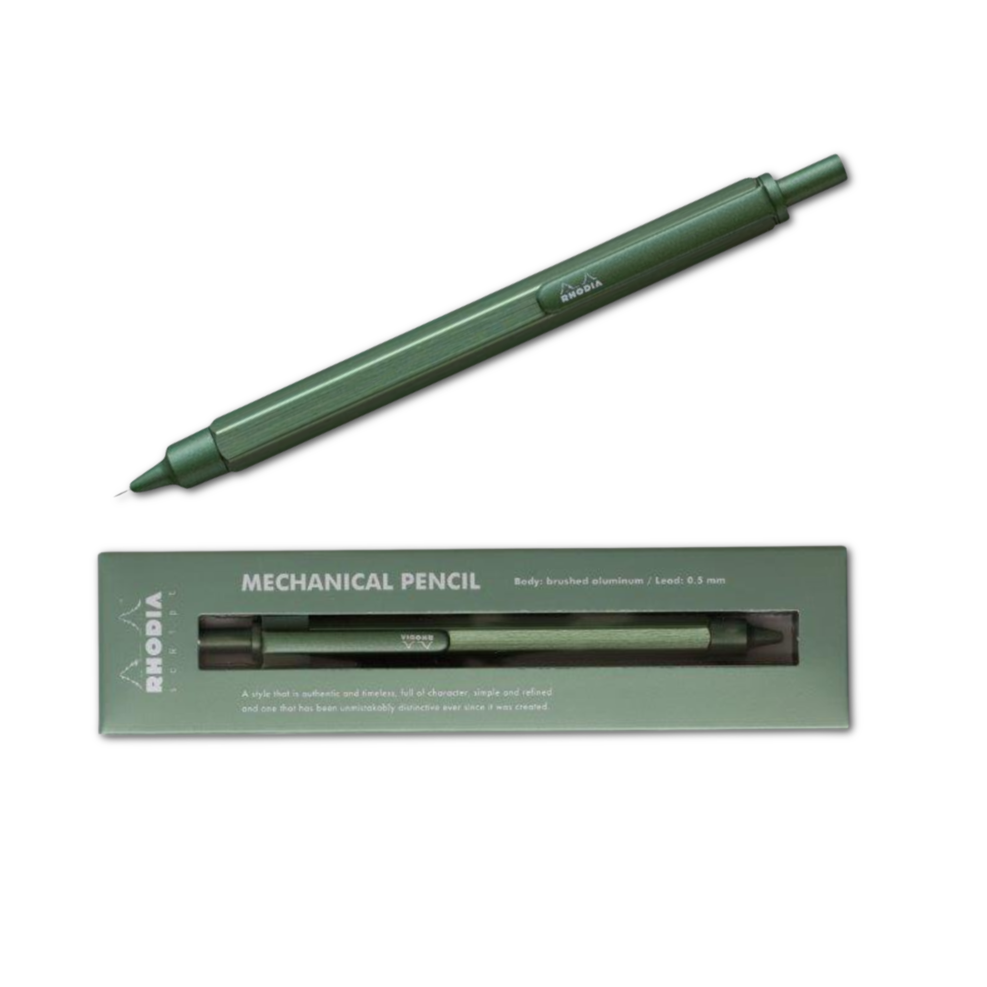 Simple, refined, timeless. Sleek brushed aluminum body in iconic Rhodia orange or black, sage green, or gold. Retractable mechanical pencil uses standard 0.5mm leads (not included). Eraser under cap.